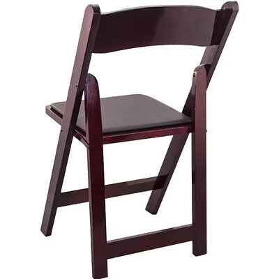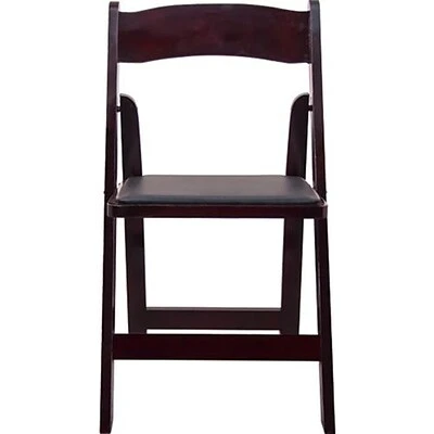 These Advantage mahogany wood folding chairs offer an attractive design to accentuate any decor. Each wood folding chair features a true beechwood frame in a mahogany finish offering a far more durable construction than competing luaun folding wood chairs. These wedding chairs include a durable, easy-to-clean black vinyl upholstered seats for a soft, comfortable seating surface. Wood folding chairs are easy to transport, especially with a folding chair caddy, providing a classic solution, versatile option for most wedding venues, banquet halls and event facilities.