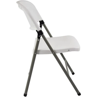These oversized white plastic folding chairs with comfortably contoured seats and backs provide a higher level of comfort over standard sized folding chairs! The seat of each plastic folding chair for sale has a waterfall style leading edge providing a means for better circulation and great overall comfort when seated. These plastic folding chairs also feature a sturdy 1-inch round, 18 gauge steel frames with welded steel crossbars in both the front and back for long term durability.