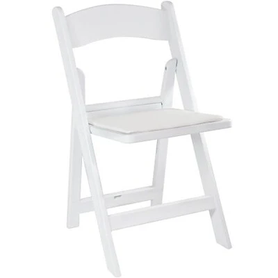 Attractive, comfortable Advantage white resin folding chairs are the perfect seating solution for indoor or outdoor venues. These wedding chairs are rated to hold up to 1,000 lbs of static weight with metal bracing in each seat to prevent breakage from thick underseat rivets. Each padded folding chair features double tubing through the lower portion of each folding chair leg. These high quality white wedding chairs also include padded seating surfaces, providing long-lasting comfort making them an excellent choice for caterers, rental chair stock, wedding and event facilities.