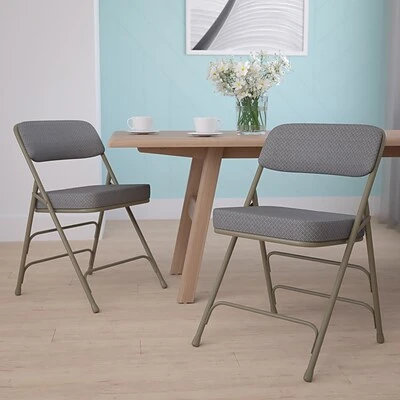 Ensure that your guests, clients, or parishioners pay more attention to you than the clock with this ultra-comfortable Flash Furniture HERCULES Series folding chair. This chair is a practical choice for social activities and everyday use in the home due to their compact storage capabilities. The steel folding chair is commercial grade to withstand heavy and daily use in any industry. Take your regular group meetings outdoors instead of staying in a stuffy room or host beautiful outdoor events with the arrangement of this two-pack of padded folding chairs. While suitable for outdoor use, store the chair indoors to protect the frame from extreme moisture. Its 18-gauge triple-braced curved steel frame supports up to 300 lbs. while the nonmarring floor glides protect your flooring from scuffs and scrapes. The uses are endless with this multipurpose chair to fulfill your seating needs for your business or home. With nothing to assemble the chair comes ready to service your needs.