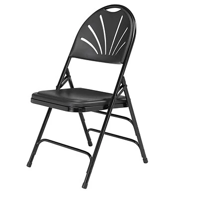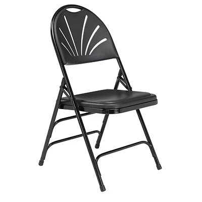 The amazingly comfortable 1100 Series Polyfold Fan-Back folding chair offers the perfect solution for both indoor and outdoor seating events such as meetings, graduations and receptions. This lightweight institutional-grade chair was made to provide you with the strengths of metal and all the benefits of plastic. The powder-coated 18-gauge tubular steel frame features three double-riveted U-braces – one in front and two in back – to securely support the double-hinged legs. The large seat and backrest are made of comfortable contoured color-impregnated plastic to prevent fading and rusting. The attractive radius fan-back provides ergonomic comfort and breathability to provide relief during long presentations. Color-coordinated V-tip stability plugs provide added reinforcement at the frame’s junction and matching replaceable glides prevent floor damage. These stack horizontally up to 26 chairs high. The 1100 Series meets MAS Certified Green and ANSI/BIFMA standards.