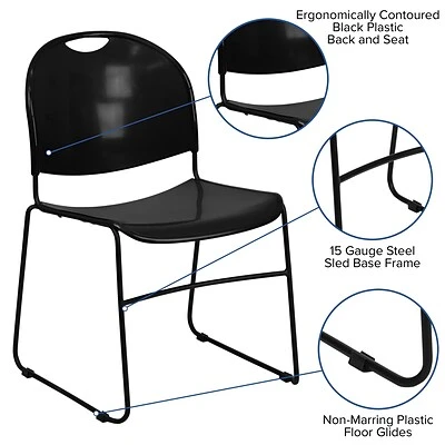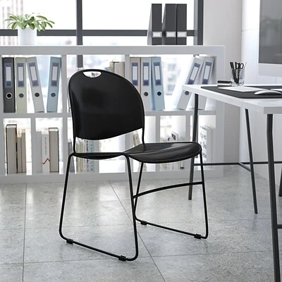 Acquire seating for any environment with these versatile sled base stack chairs. The ergonomic design contours to your body for an amazing seating experience. Host parties and game night at your home keeping extra seating on hand that can be placed in a corner, stacked until your next gathering. Line these chairs up for a uniform look in your conference center, training room or business center. After conferences these chairs stack neatly in your storage room, up to 35 high to clean the event space. Transport by the carrying handle or on our compatible sled base stack chair dolly when moving to different locations within the building. Add comfort to your home, hair salon, office, waiting room, lunchroom, classroom or adult education center with these heavy-duty plastic stack chairs.