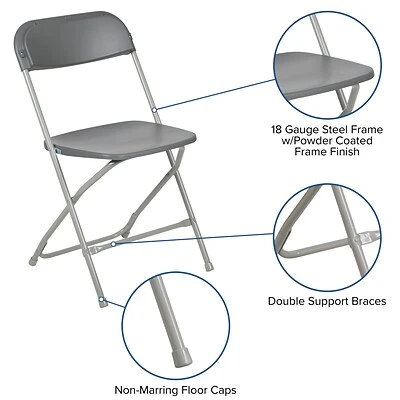 Commercial-grade plastic folding chairs designed to be lightweight but durable. This product is engineered and built with premium materials that will withstand heavy duty use for event, business and home usage. These folding chairs will nest easily to stack 50 high from the floor and feature a textured contoured plastic seat for the highest level of comfort and security. With a variety of color options you can choose what would best pair with your event needs. This is a commercial-grade on-demand seating solution convenient for weddings, school functions, barbecues, game night, and catering events. Stay comfortable during social events with the gentle contour shaped seat and back. Folding chair highlights: – Ready-to-use with no assembly required – Hassle free stackable storage – Textured seat designed for maximum comfort and security – Floor caps to prevent surface and flooring damage – 650LB weight capacity These low-maintenance party event chairs wipe down easily after luncheons and stack neatly for storage or floor maintenance. Make a smart investment by purchasing multiple plastic folding chairs for your rental business, waiting room or corporate training rooms. Purchase our folding chair truck for quick and easy set up and take down.